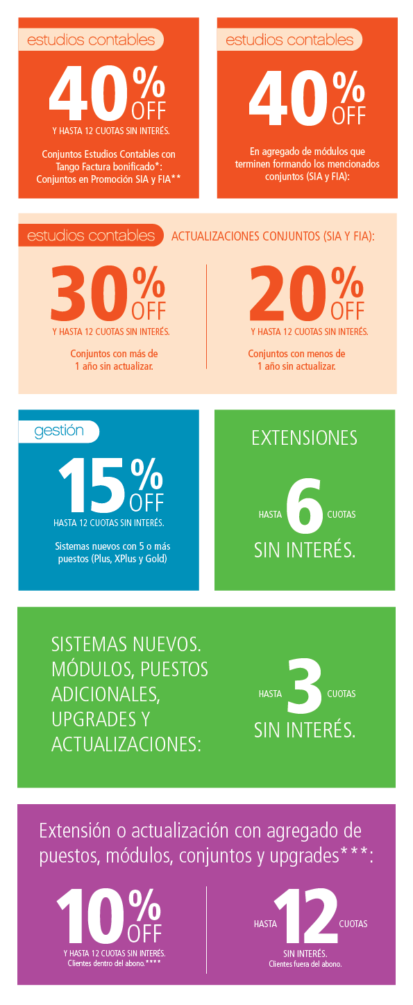 Todas las promociones son válidas hasta las 16hrs del 31/01/2019. (*) Promoción exclusiva para vender a Contadores o Estudios Contables. Pack de TANGO Factura con cantidad de comprobante a emitir ilimitado. Se tomará el pedido únicamente con la presentación de la matrícula escaneada del Contador que adquiere el conjunto. (**) SIA: Compuesto por los módulos: Sueldos, Contabilidad, IVA e Ingresos Brutos. FIA: Compuesto por los módulos: Sueldos, Contabilidad, IVA e Ingresos Brutos, Activo Fijo. (***) Promoción exclusiva para clientes que deban Extender o Actualizar y además agregar Puestos, Módulos, Conjuntos, o realizar algún Upgrade. Los clientes fuera del abono deberán actualizar previamente. En caso de realizar upgrades (únicamente sobre TU) ya cuentan con un descuento del 30%. (****) Será requisito que su sistema esté actualizado o haya sido comprado con fecha anterior al 01/01/2019. El descuento del 10% no aplica sobre la extensión. |